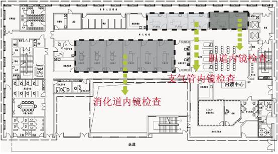 集中布置:是將呼吸系統(tǒng)、消化系統(tǒng)、泌尿系統(tǒng)的內(nèi)鏡診斷和治療的空間集中設(shè)置在一個合理的區(qū)域。其平面除了布置除各種性質(zhì)相近的檢查室相對集中外,還需要配備常用的輔助檢查室,如準(zhǔn)備、處置、庫房、灌腸、洗滌、辦公等用房。